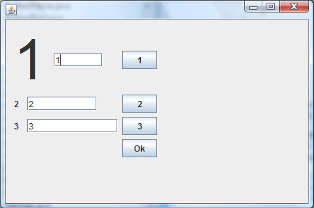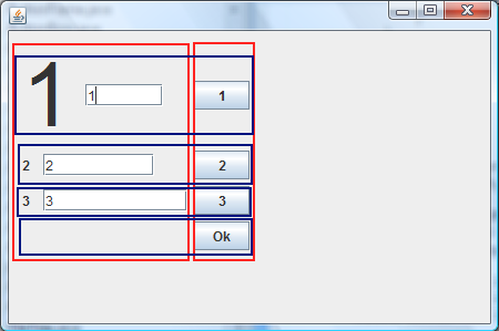 Beispiel: Wir stellen die Font eines unserer Labels auf 80 und wollen, dass die Textfeld und Button in der Mitte der Zeile angezeigt werden. Wir setzten für unsere Textfelder unterschiedliche Preferred Sizes und wollen dass die Buttons alle schön untereinander stehen und gleich breit sein. Ausserdem soll das Layout nur so viel Platz wie nötig ausfüllen.