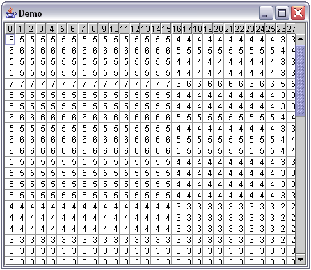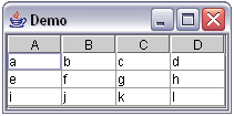 [Bearbeiten | Quelltext bearbeiten]Die wohl einfachste Methode ist einen 2-dimensionalen Array zu benutzen. Das JTable bietet einen entsprechenden Konstruktor: