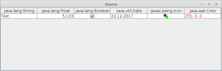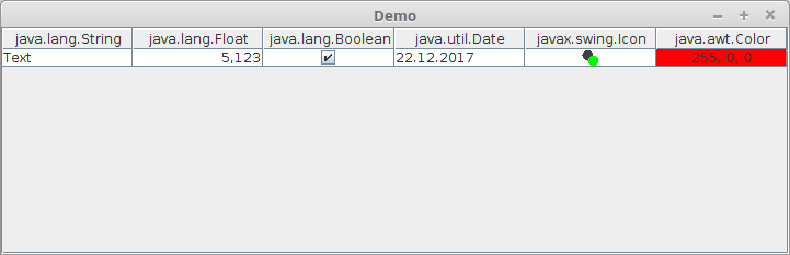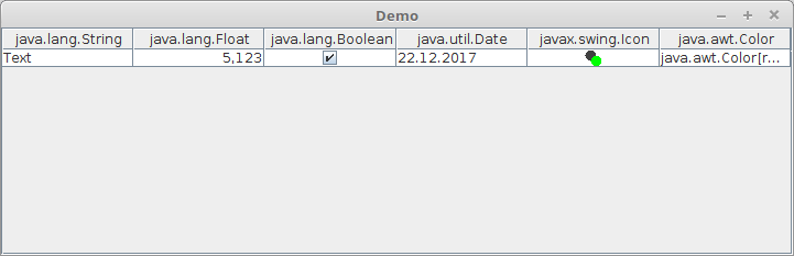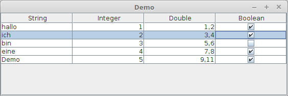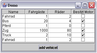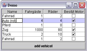 [Bearbeiten | Quelltext bearbeiten]Mit einem DefaultTableModel.