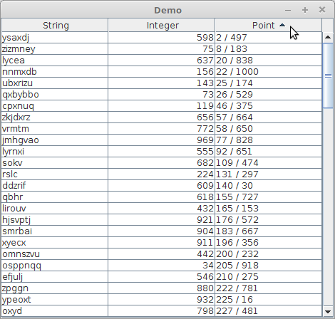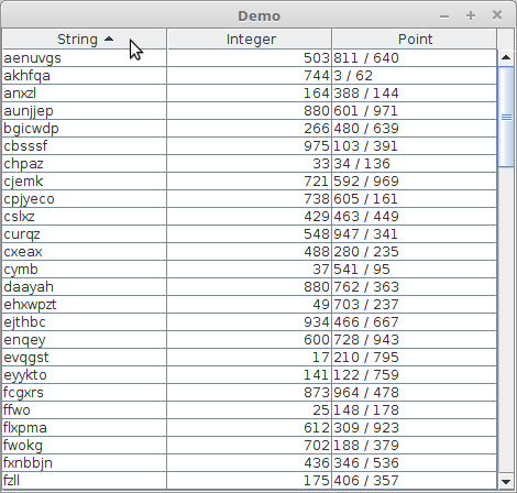 [Bearbeiten | Quelltext bearbeiten]Im Beispiel des 1. Abschnittes wurden die String- und die Integer-Spalte sinnvoll sortiert, die Point-Spalte sah hingegen komisch aus. Damit auch diese Spalte sinnvoll sortiert wird (ohne dass man eine neue Point-Klasse implementiert), muss man einen Comparator bereitstellen. Dieser Comparator kann man über die Methode setComparator() des TableRowSorters einbinden.