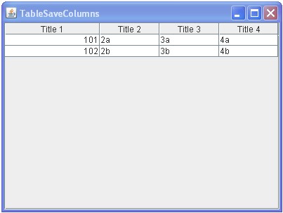 Dieses Beispiel zeigt, wie wir den Zustand einer JTable speichern können (Daten, Spaltenbreite und -position), so dass sie nach einem Programmneustart wieder geladen werden kann.