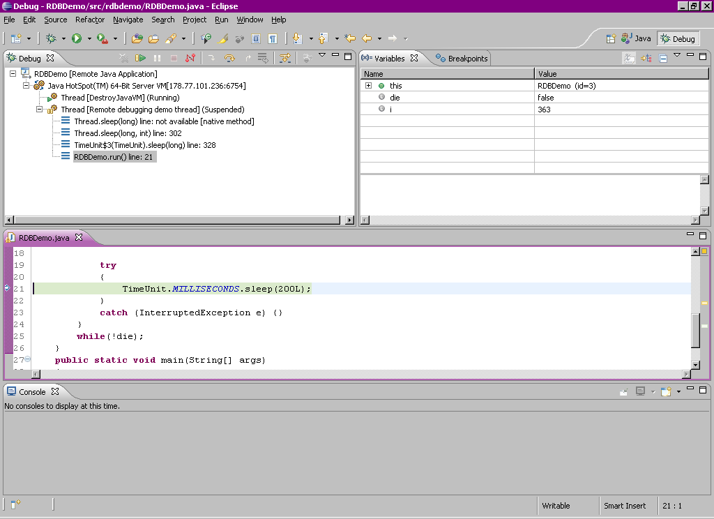 5. Damit lässt sich die Anwendung remote genauso wie lokal debuggen. Inkl. Threads pausieren, Breakpoints, Variablenzugriff, zeilenweises abarbeiten und was es sonst noch so alles gibt.