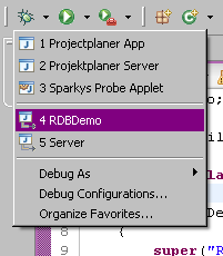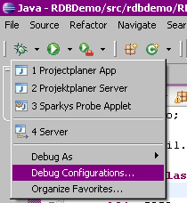 [Bearbeiten | Quelltext bearbeiten]1. Nun müssen wir als Erstes die Debug-Konfiguration in Eclipse öffnen: