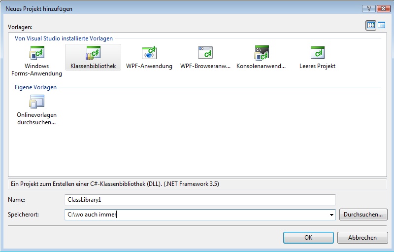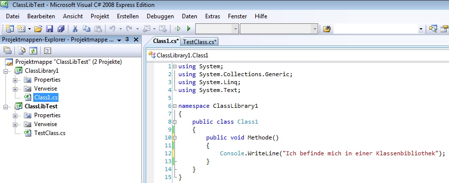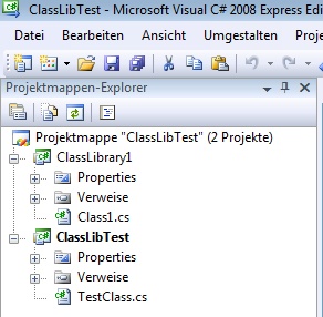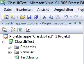 [Bearbeiten | Quelltext bearbeiten]Wie man eine Klassenbibliothek erstellt, möchte ich mittels VisualStudio 2008 Express Edition (diese Version ist kostenlos) anschaulich erläutern.