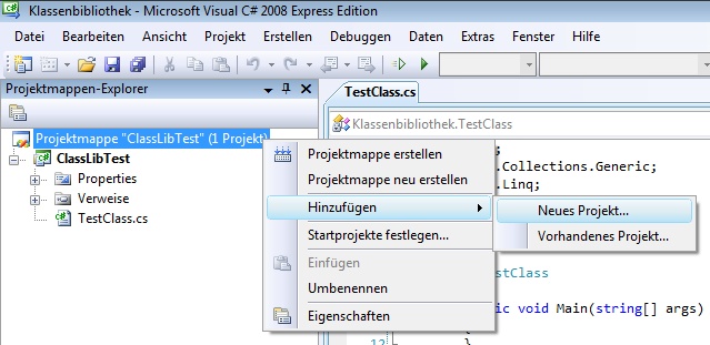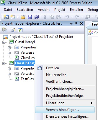 Vorraussetzung ist das Vorhandensein eines geöffneten Projekts, hier eine Konsolenanwendung mit dem Namen ClassLibTest (Abb.1).