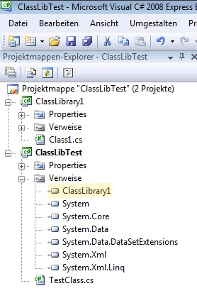 - Im Verzeichnis Verweise unseres Projektes ClassLibTest sollte nun die Klassenbibliothek ClassLibrary1 stehen, wie in Abb.7.