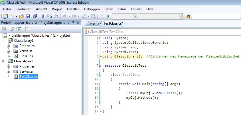 Um nun mit Objekten der Klassen von ClassLibrary1 arbeiten zu können, ist die vollständige Angabe notwendig. Namespace.Klasse objekt = new Namespace.Klasse();.