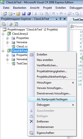 - Zum Schluss legen wir das Projekt ClassLibTest noch als Startprojekt fest, wie es Abb.8 zeigt.