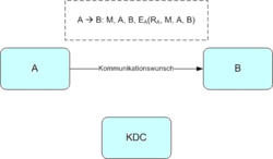 [Bearbeiten | Quelltext bearbeiten]- A sendet an B ein Paket mit seiner A und der ID von B B sowie eine Zufallszahl M, als Transaktionsmerkmal und einem verschlüsselten Teil. Dieser Teil ist mit einem Schlüssel verschlüsselt den nur A und das KDC kennt EA und er enthält auch seine und die ID von B, eine erzeugte Zufallszahl RA sowie eine weitere Zufallszahl.