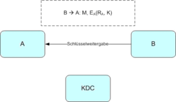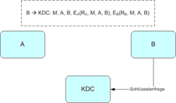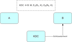- B empfängt die Daten und kann den Teil für ihn entschlüsseln und erhält so den Sitzungsschlüssel K, durch den Zufallswert RB der noch enthalten ist kann die Aktualität überprüft werden. Den anderen Teil übermittelt er, mit dem Transaktionsmerkmal M unverändert an A. Anschließend kann die Kommunikation zwischen A und B mit dem Sitzungsschlüssel K beginnen.