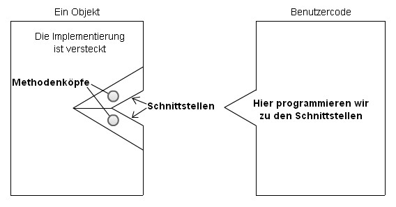 [Bearbeiten | Quelltext bearbeiten]Schnittstellen sind die Verbindung eines Objektes zum Benutzercode. Dieser kann dann zu den Schnittstellen programmieren, ohne sich um die versteckte Implementierung des Objekts kümmern zu müssen:
