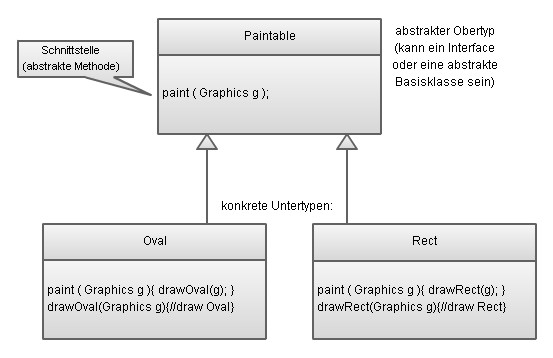 [Bearbeiten | Quelltext bearbeiten]Das Wort Schnittstelle ist im Java-Sprachgebrauch überladen. Im vorliegenden Artikel hat es die Bedeutung von abstrakte Methode. Daneben wird es aber auch oft als deutsche Übersetzung für das Java-Konstrukt interface benutzt. Einerseits macht das Sinn, da ein "interface" ja abstrakte Methoden enthält, andererseits passt es aber nur bedingt, weil eine abstrakte Basisklasse ebenfalls abstrakte Methoden enthält. Im vorliegenden Artikel werden deshalb die Begriffe "interface" und "abstrakte Basisklasse" unter dem allgemeineren Begriff abstrakter Obertyp zusammengefasst. Der Begriff "abstrakter Obertyp" bietet zudem eine ideale Überleitung zur Polymorphie, die ja die Beziehungen zwischen Ober- und Untertypen beschreibt.