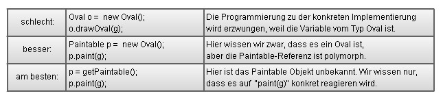 In Java hängt das Konzept der Schnittstellen also eng zusammen mit den Begriffen abstrakte Methode, abstrakter Obertyp (Interface oder abstrakte Basisklasse) und Polymorphie. Es ermöglicht das Programmieren zu den Schnittstellen, ohne Festlegung von konkreten Implementierungen. Dadurch ist der Benutzercode weniger anfällig für Veränderungen in den Einzelheiten der Implementierung.