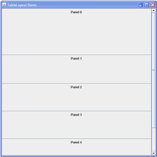 Die unten gezeigte Klasse "TableLayout" ermöglicht das Anordnen von Swing Komponenten in Form einer Tabelle. "TableLayoutDemo" zeigt ein Beispiel, wie sie verwendet werden kann: