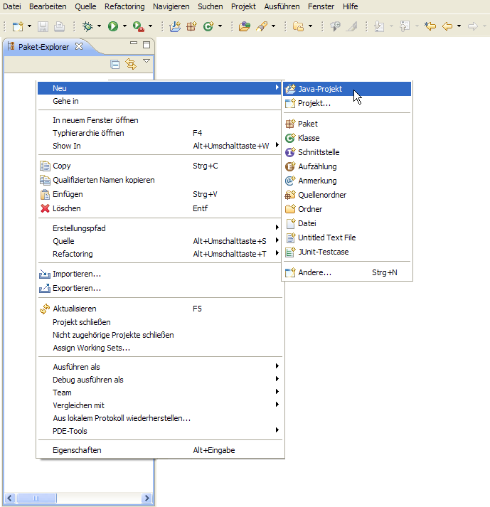 Zuerst erstellen Sie im Package-Explorer ein neues Projekt namens ImageUpload: Rechtsklick im Package-Explorer -> Neu -> Java Projekt [New -> Java Project]: